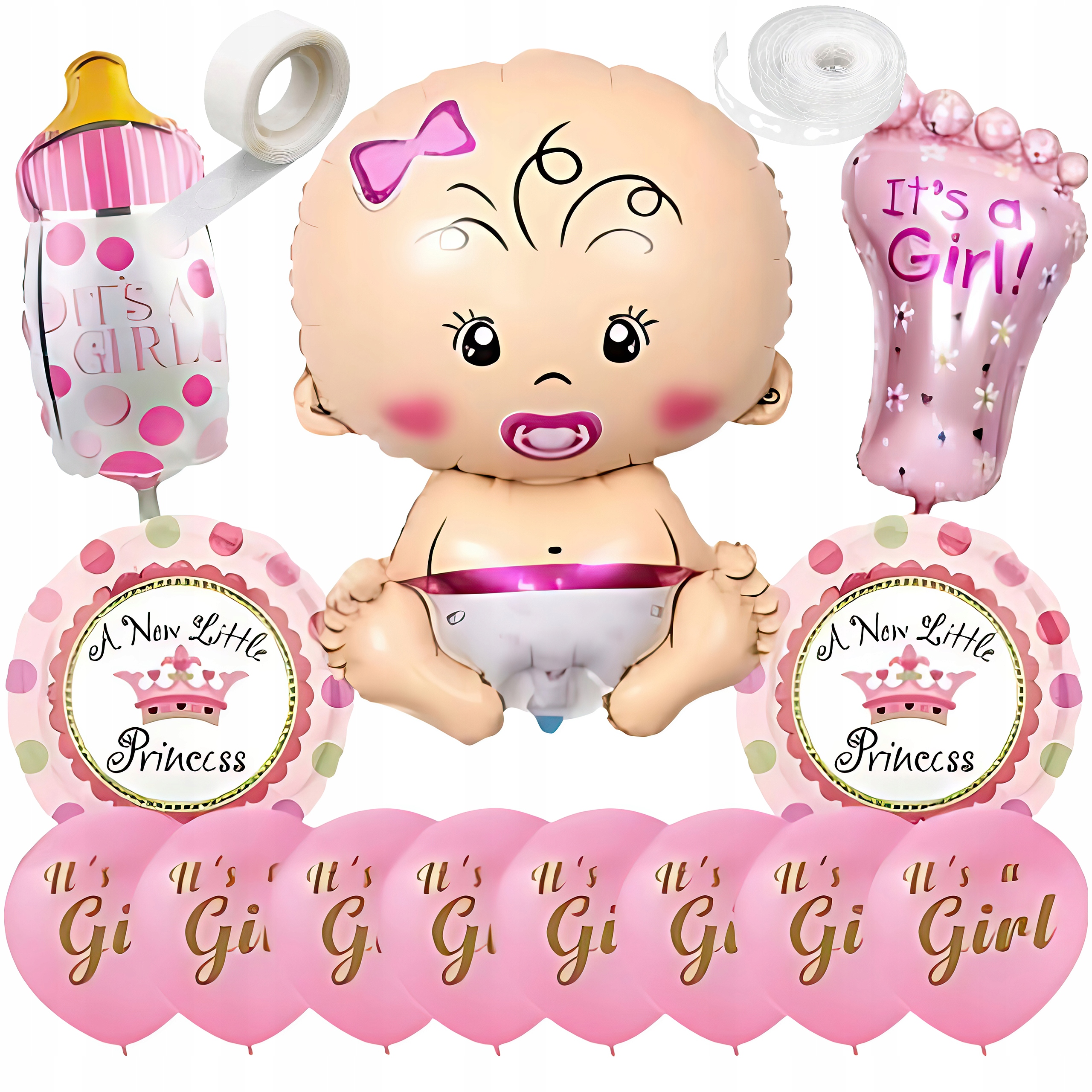 ✔️ Stylowa dekoracja – Połączenie różowych balonów, napisu „IT’S A GIRL”, balonów w kształcie dziecka, stópki i butelki tworzy elegancką, dziewczęcą atmosferę.