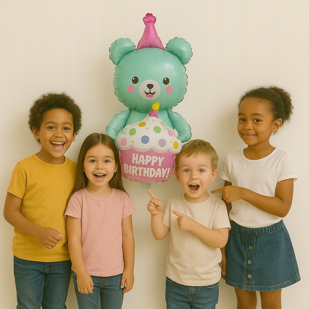 Balon foliowy w kształcie siedzącego turkusowego misia to idealna ozdoba dla małych księżniczek! Uroczy, miękki w wyglądzie, z serduszkiem i łapkami – rozczula i zachwyca każdego gościa.