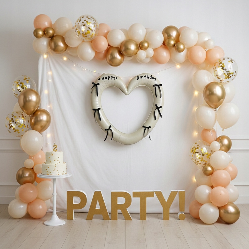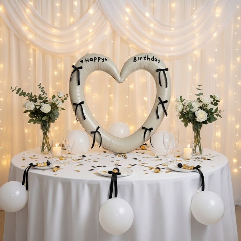 Ten balon foliowy w kształcie serca z napisem „Happy Birthday” został stworzony z myślą o tym, by stać się centralnym punktem urodzinowej aranżacji. Jasna, subtelna kolorystyka i czarne kokardki dodają mu szyku – idealnie pasuje do nowoczesnych, minimalistycznych i glamour dekoracji.