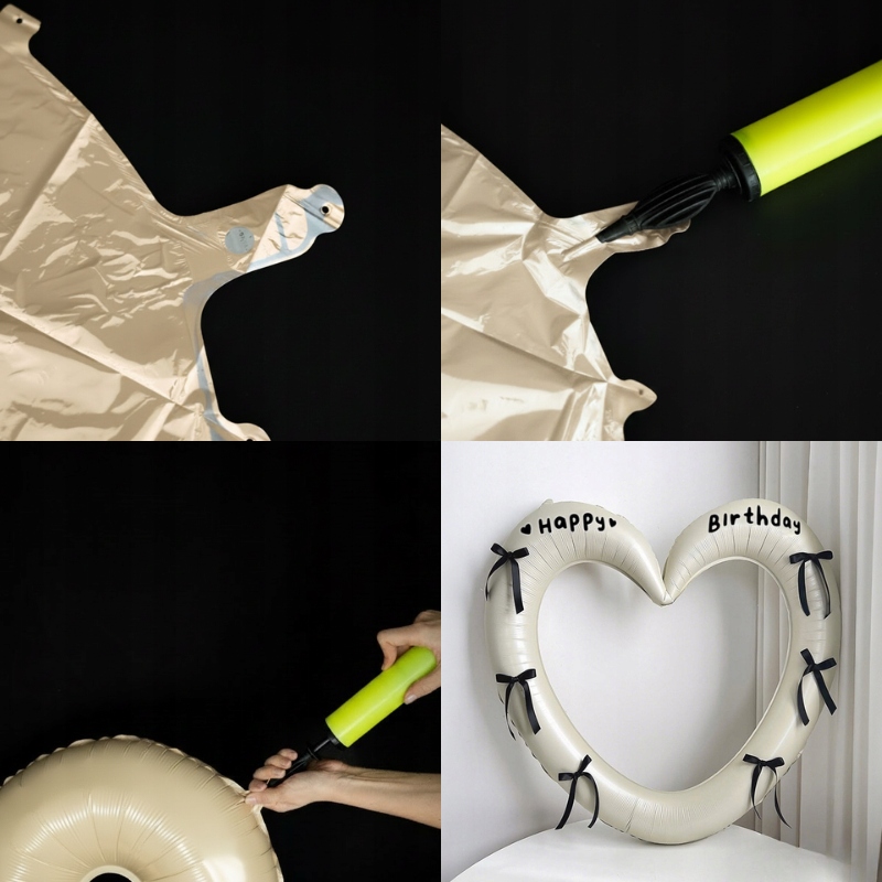 Balon foliowy można pompować helem lub powietrzem. Napełnienie helem pozwoli balonowi unosić się, jednak zalecamy zabezpieczenie go sznurkiem, aby utrzymać go w wybranym miejscu i pozycji.