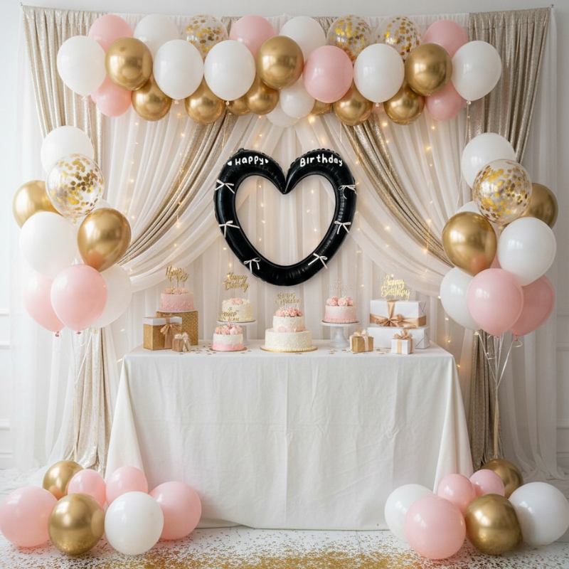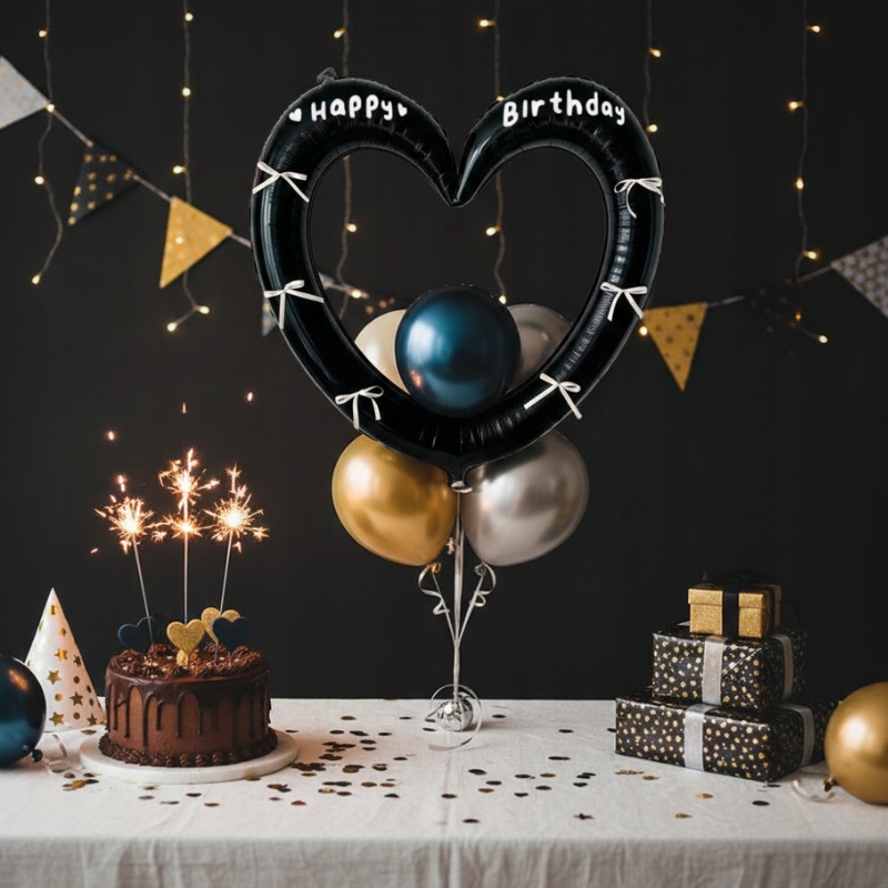 Ten balon foliowy w kształcie serca z napisem „Happy Birthday” został stworzony z myślą o tym, by stać się centralnym punktem urodzinowej aranżacji. Ciemna kolorystyka i kontrastujące białe kokardki dodają mu szyku – idealnie pasuje do nowoczesnych, minimalistycznych i glamour dekoracji.