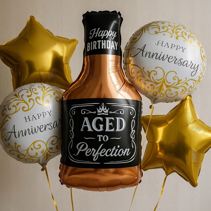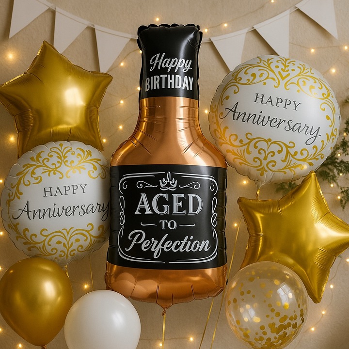 Szukasz efektownej dekoracji na urodziny, jubileusz czy wyjątkową rocznicę? Nasz elegancki zestaw balonów foliowych to idealny wybór dla osób ceniących styl, jakość i niezapomniane dekoracje ! Balony w kształcie butelki whisky, gwiazdek oraz okrągłych ozdobnych balonów z napisami „Happy Anniversary” stworzą wyjątkowy klimat każdej jubileuszowej uroczystości.