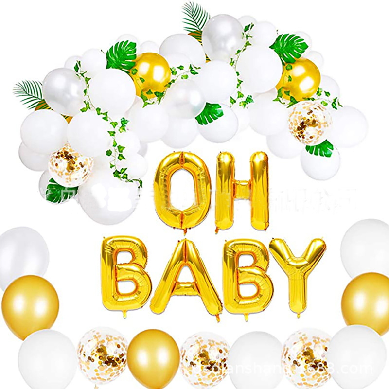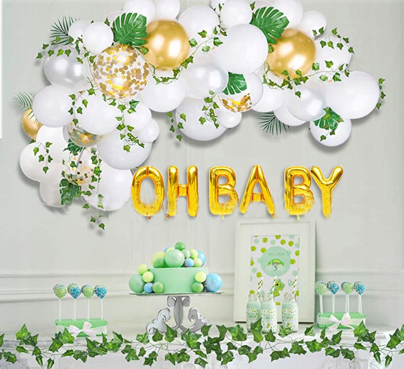 ✔️ Stylowa dekoracja – Połączenie złotych i białych balonów z napisem „OH BABY” oraz balonami confetti i liśćmi tworzy elegancką atmosferę, idealną na przyjęcia.