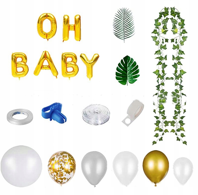 - Stylowy zestaw – Zestaw zawiera balony w złotych i białych kolorach oraz napis „OH BABY”, który idealnie wpasowuje się w tematykę Baby Shower i urodzin.