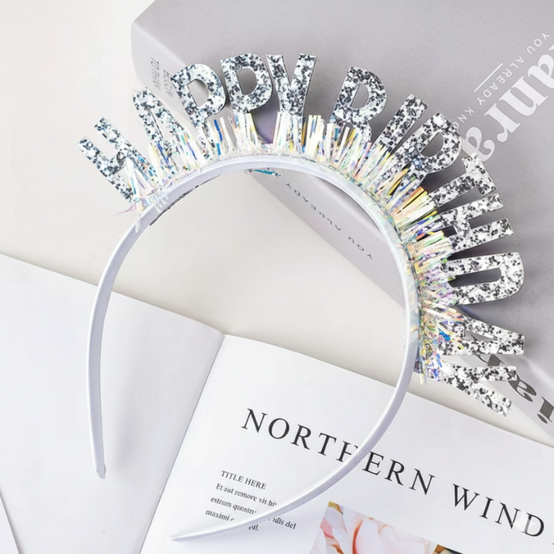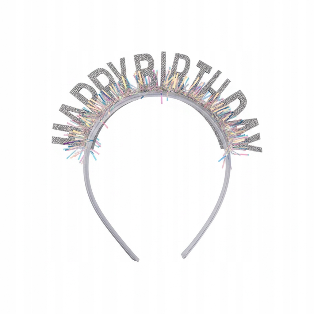 Opaska urodzinowa Happy Birthday srebrna brokatowa urodziny korona
