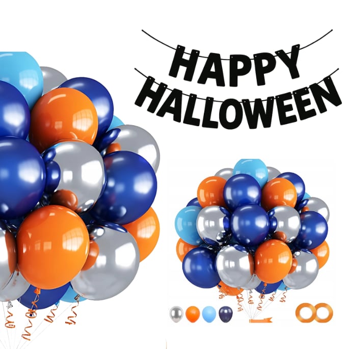 PartyOn DEKORACJE HALLOWEEN Balony Napis Baner Czarny Zestaw Balony Pomarańczowe Niebieskie Srebrne