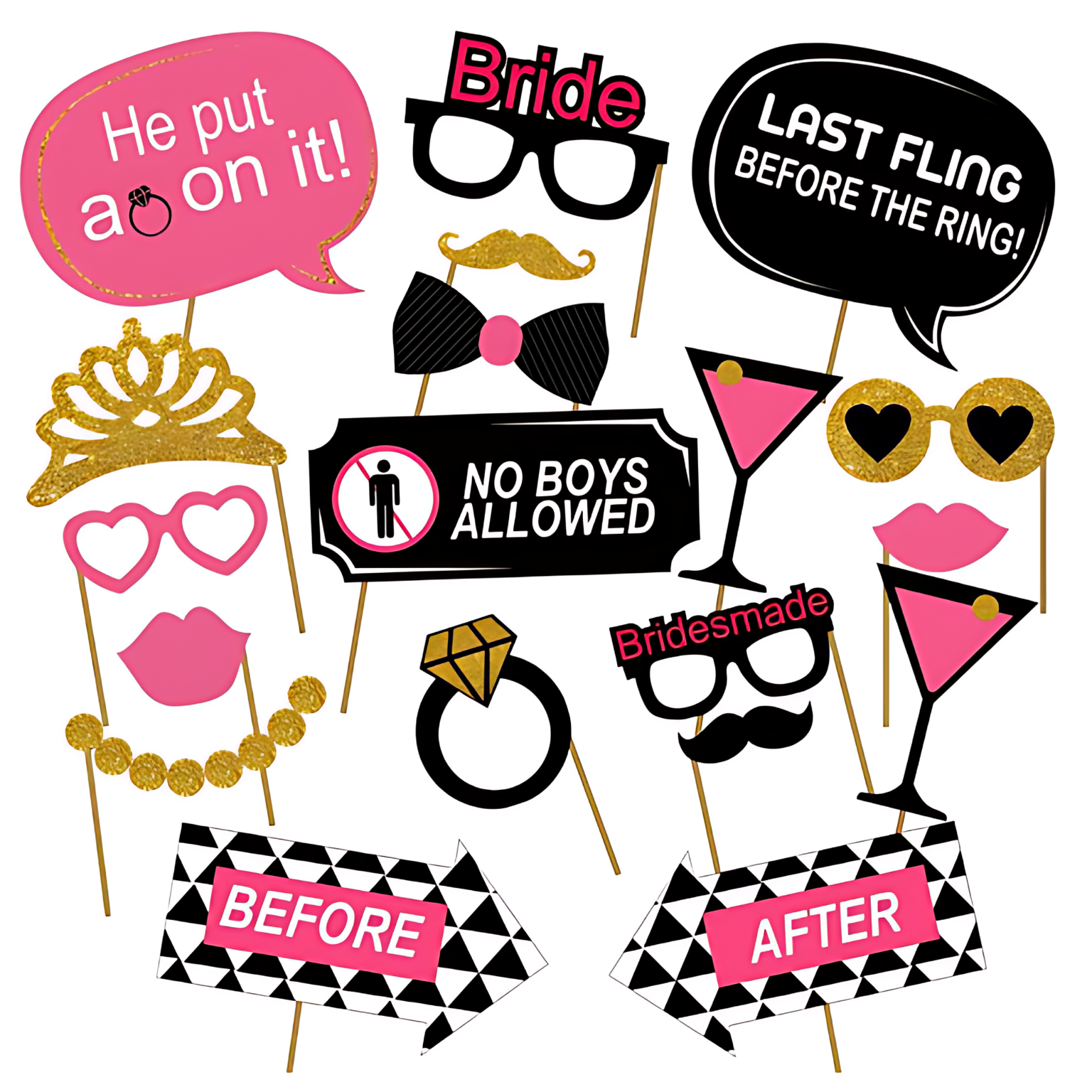 Zamień zwykłe zdjęcia w totalną petardę! Ten zestaw rekwizytów do fotobudki to szybki sposób na stworzenie kącika foto na wieczór panieński, bridal shower lub imprezę „Bride to Be”. Róż, złoto i czerń robią elegancki efekt, a zabawne hasła i gadżety rozkręcają atmosferę od pierwszego ujęcia.