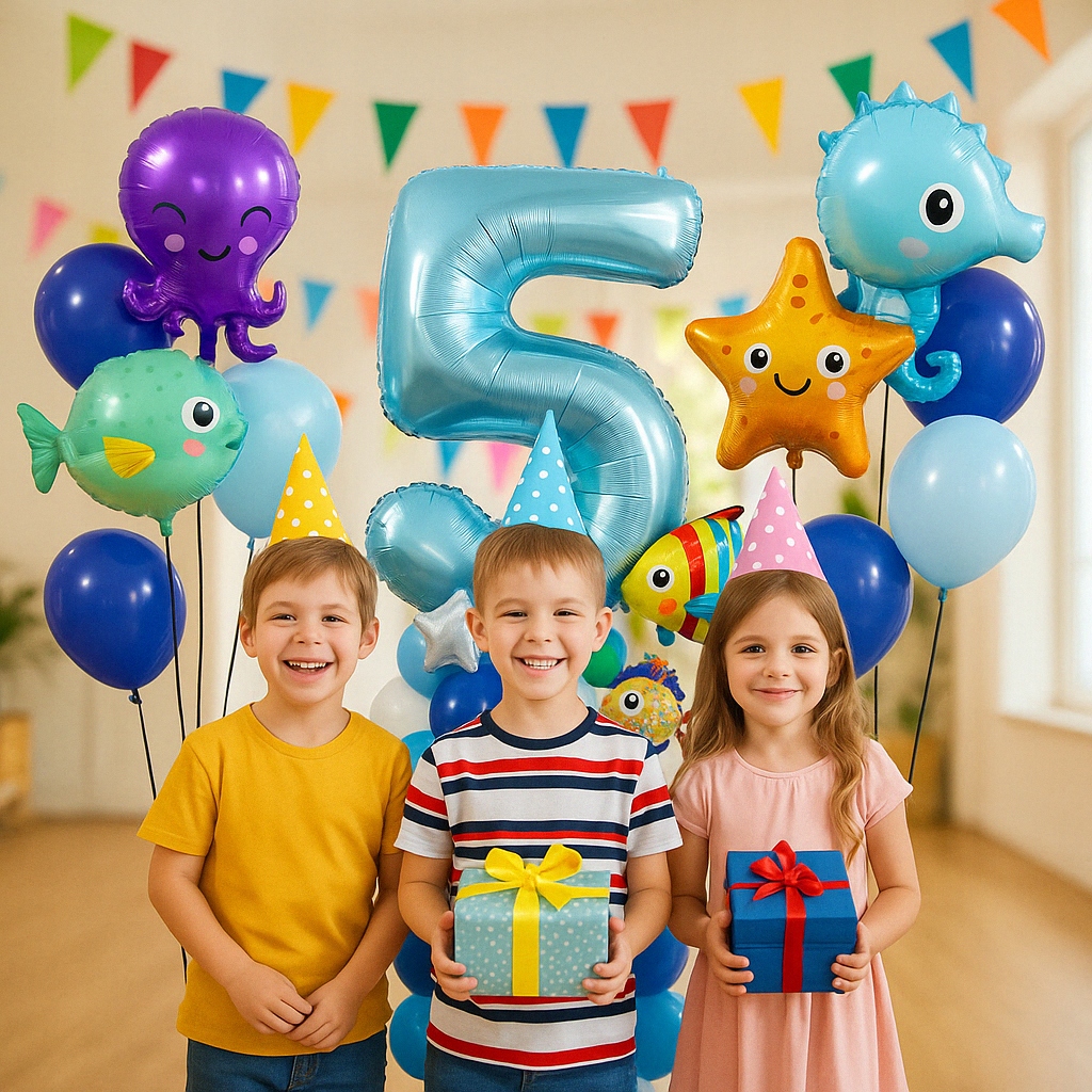 BALONY FOLIOWE NIEBIESKIE CYFRA 5 ZWIERZĘTA MORSKIE DEKORACJA ZESTAW PARTY