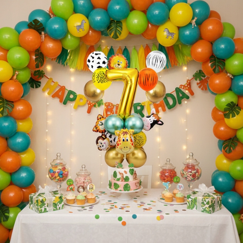 Stwórz niezapomnianą, kolorową dekorację urodzinową z motywem dżungli i ulubionych zwierząt! Idealny zestaw na 7. urodziny dziecka – chłopca lub dziewczynki!