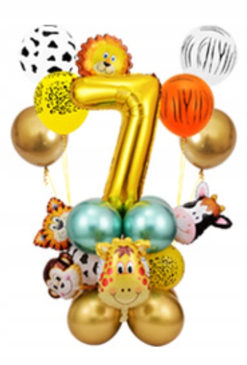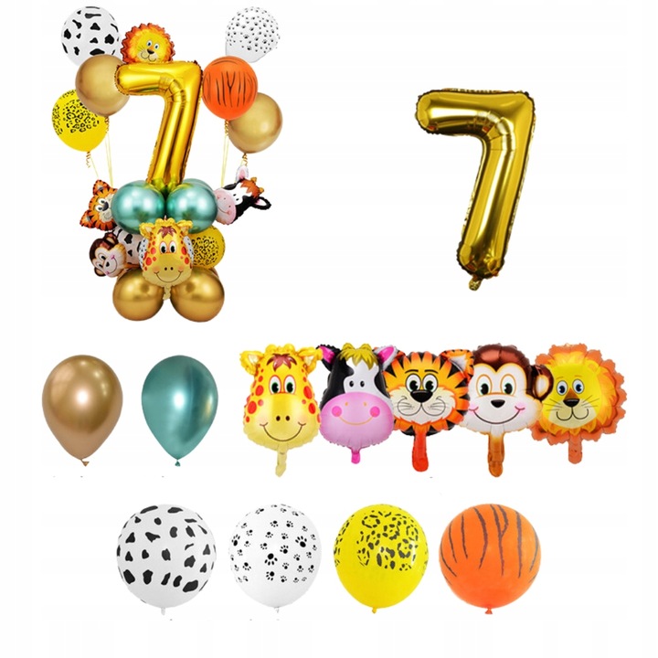 ✨ZESTAW BALONÓW URODZINOWYCH – CYFRA 7 + ZWIERZĘTA ZOO + ZŁOTE DODATKI